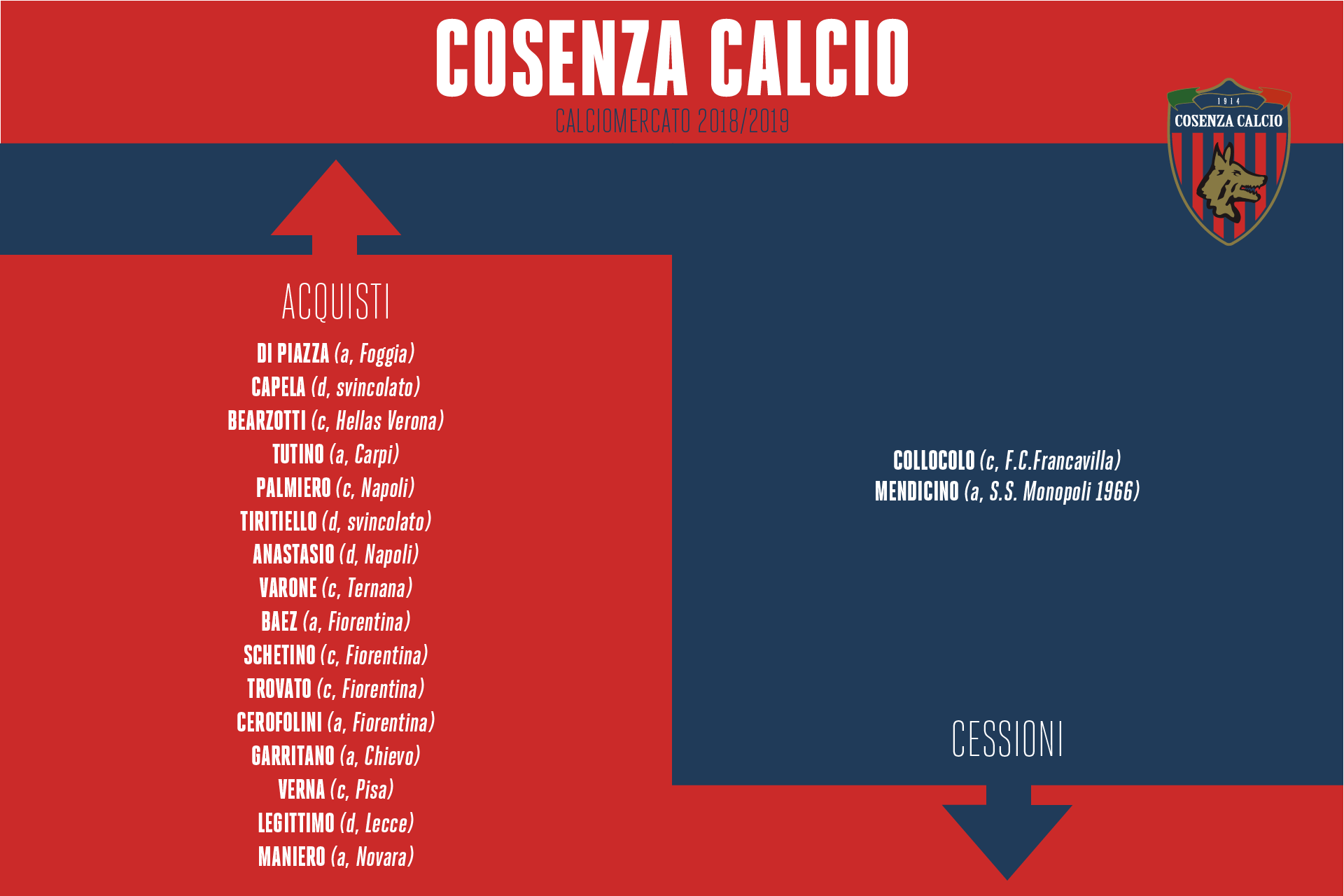 Si è chiuso oggi, alle ore 20.00, il calciomercato di Serie BKT: di seguito, la grafica che racchiude tutte le operazioni concluse dal Cosenza Calcio al gong di questa sessione.
