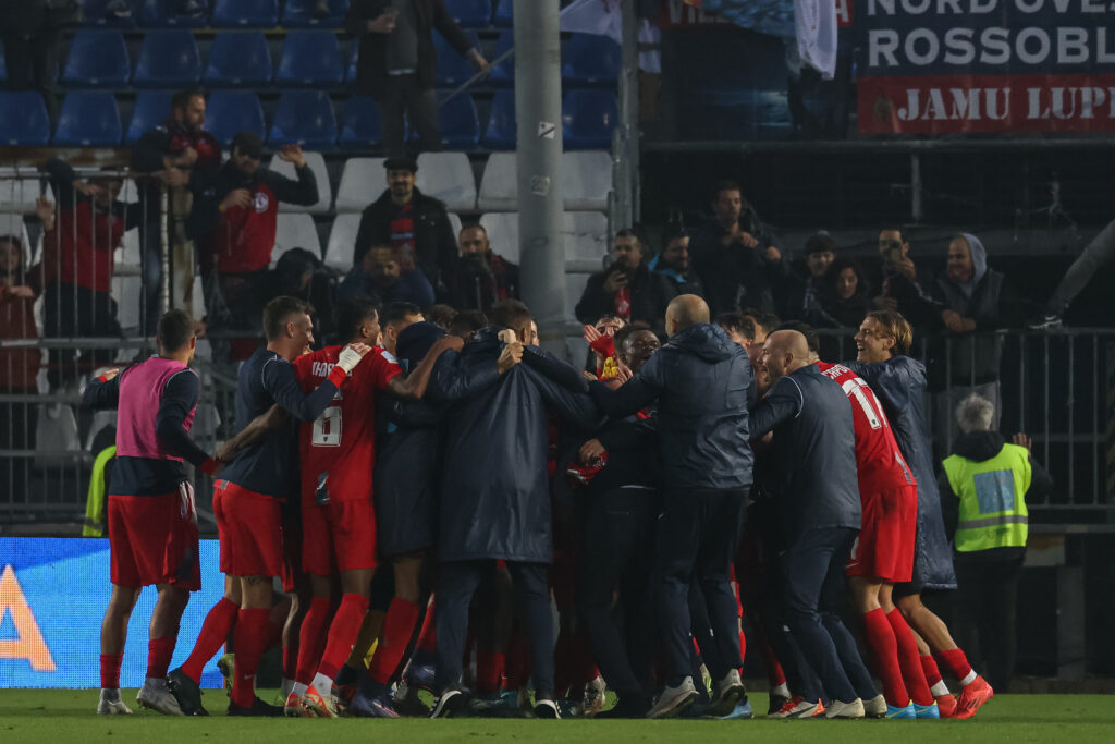 Cosenza players celebrate at the end of the match during the Serie Bkt match between Brescia and Cosenza at the Mario Rigamonti Stadium, Saturday, Nov. 9, 2024. Sports - Soccer. (Photo by Stefano Nicoli/LaPresse)