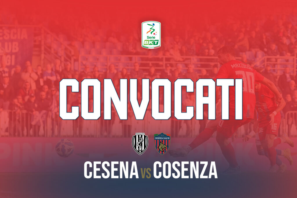 Di seguito i convocati (corredati dal numero di maglia) per la gara tra Cesena e Cosenza valida per la diciassettesima giornata di Campionato Serie BKT in programma sabato 14 dicembre allo stadio “Orogel Stadium Dino Manuzzi” con fischio d’inizio alle ore 15:00: